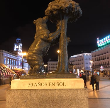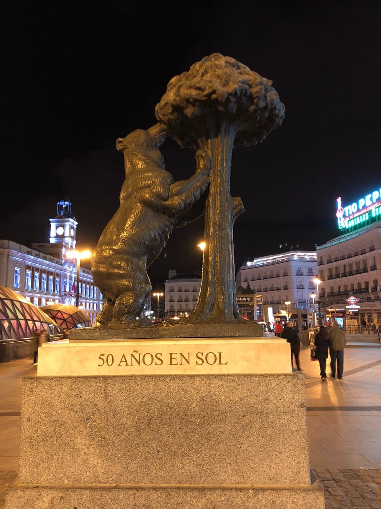 Assim que chegamos a Madrid, já almoçamos em um restaurante na própria rua do Hotel Francisco I, na Calle Arenal, 15. À noite, fomos ao El Corte Inglés. O hotel fica muito perto da Puerta del Sol (onde está o famoso urso e o medronheiro, símbolo da cidade de Madrid).